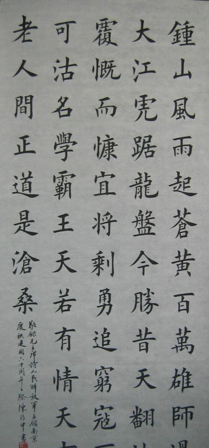 陈乃中先生一直专攻楷书,他的楷书取法于钟繇、欧阳询、颜真卿等人,点画非常精致,字形结构达到了前人的书写要求。尽管当下有些书法家对楷书的要求有所不同,他们强调书法艺术性,使得楷书在书写及风格上较之于历史上的要求都发生了质的变化,这些都能从一些展览中看出端倪,但在楷书书写的道路上,仍有很多书法爱好者遵传统、守风格,使当代楷书学习者的队伍不断壮大。